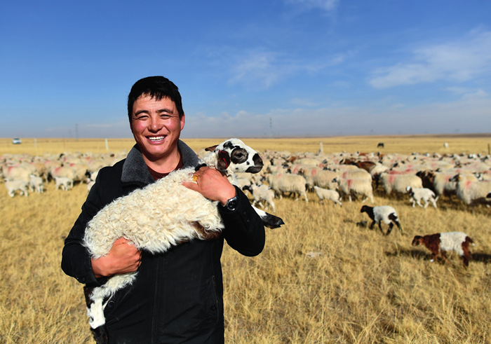 青海省剛察縣泉吉鄉(xiāng)寧夏村牧民達(dá)日杰懷抱一只小羊羔(11月12日攝) 張宏祥攝/本刊