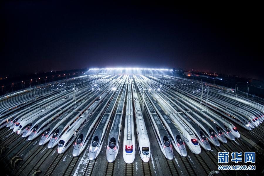 動(dòng)車組停靠在武漢動(dòng)車段的存車線上,準(zhǔn)備進(jìn)行檢修和保溫作業(yè)(2018年2月1日攝)。新華社記者 肖藝九 攝