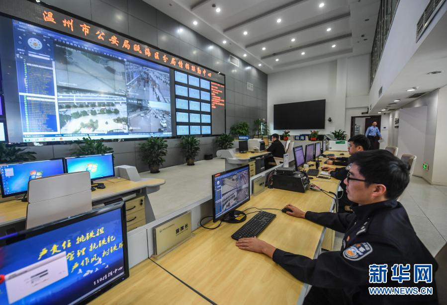 浙江省溫州市甌海區(qū)公安分局指揮中心內(nèi),警務(wù)人員在后臺實(shí)時監(jiān)控各類動態(tài)信息(2018年11月14日攝)。該局依托互聯(lián)網(wǎng)大數(shù)據(jù)等新手段,打造管理新模式,全面提升了警務(wù)效能。新華社記者 徐昱 攝