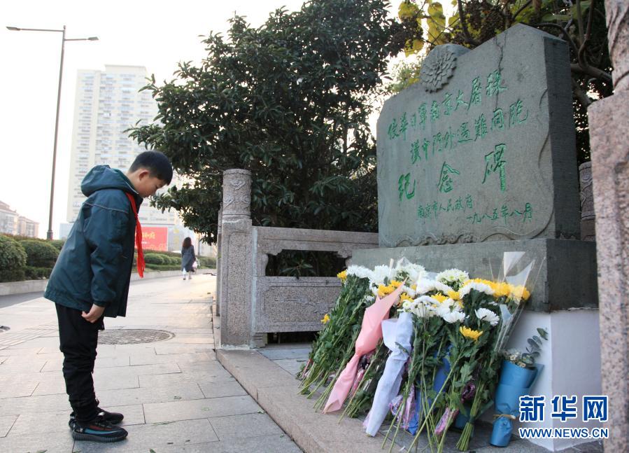 12月12日,一名小學生在侵華日軍南京大屠殺漢中門外遇難同胞紀念碑前鞠躬。新華社發(fā)(劉建華 攝)