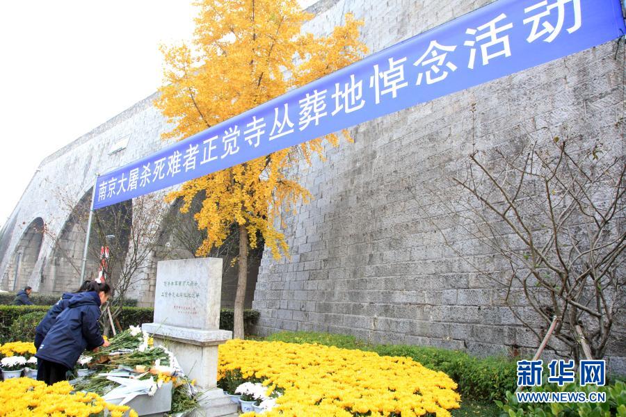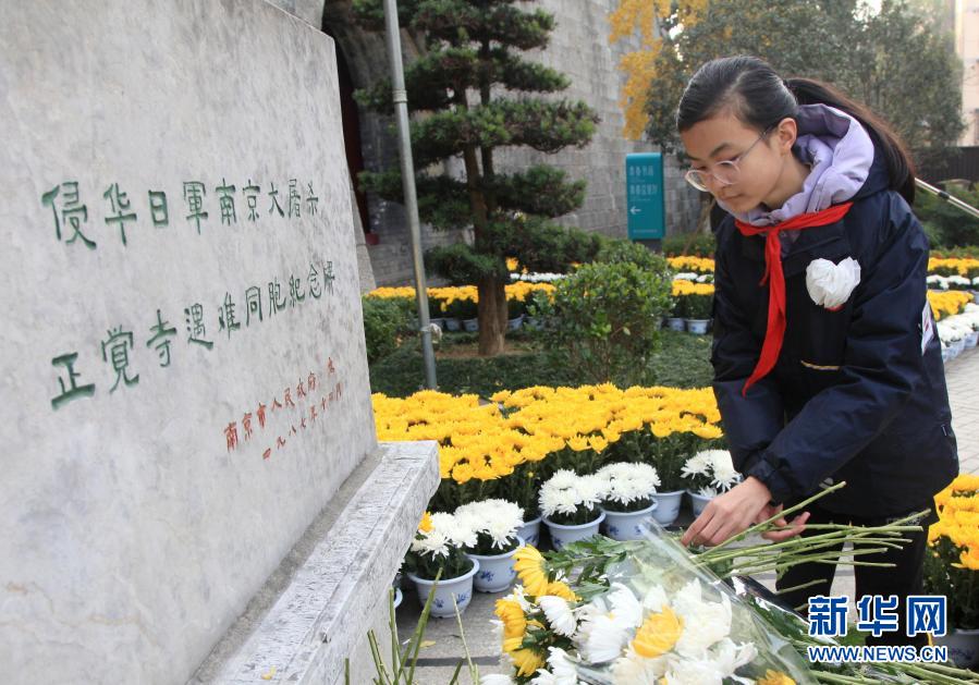 12月12日,在侵華日軍南京大屠殺死難同胞叢葬地(正覺寺),參加悼念活動的小學生向遇難同胞紀念碑獻花。新華社發(fā)(劉建華 攝)