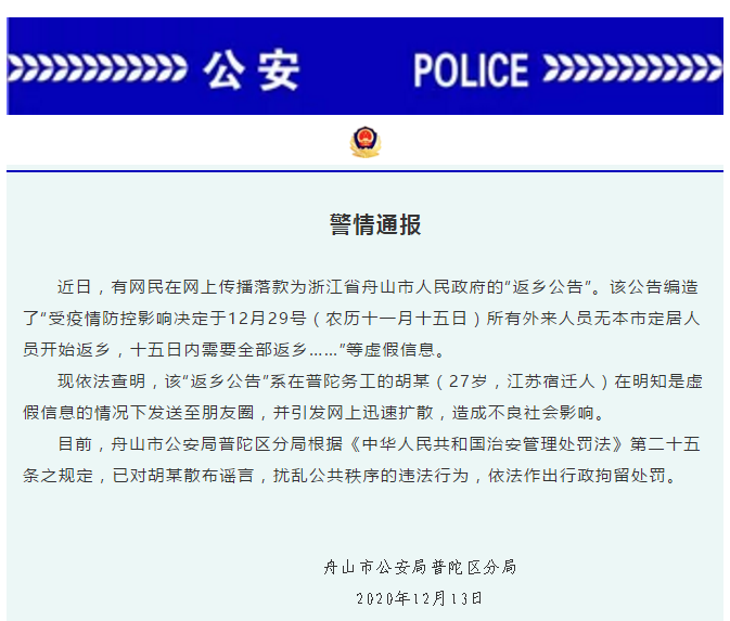 現(xiàn)依法查明,該“返鄉(xiāng)公告”系在普陀務(wù)工的胡某(27歲,江蘇宿遷人)在明知是虛假信息的情況下發(fā)送至朋友圈,并引發(fā)網(wǎng)上迅速擴(kuò)散,造成不良社會影響。