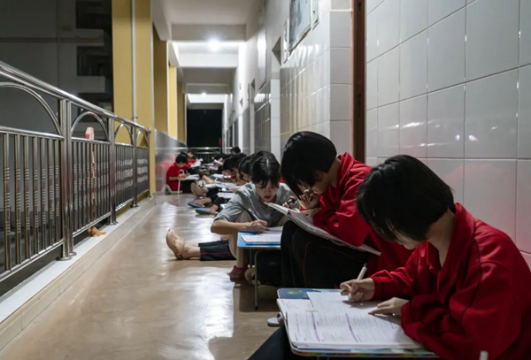 子夜時分,華坪女高的宿舍樓樓道內(nèi)燈火通明,學生在樓道里支起小桌,席地而坐,老師在樓道內(nèi)來回巡視,為學生答疑解惑。