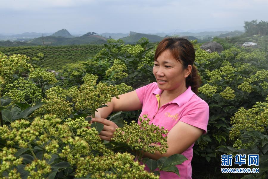 廣西羅城仫佬族自治縣小長(zhǎng)安鎮(zhèn)民族村村委會(huì)主任覃鳳瓊在查看吳茱萸長(zhǎng)勢(shì)(6月21日攝)。新華社發(fā)(韋如代 攝)