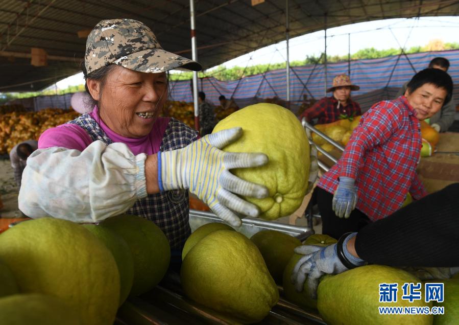 在廣西羅城仫佬族自治縣金玉柚生態(tài)產(chǎn)業(yè)扶貧示范區(qū),村民在分揀柚子準(zhǔn)備裝車(chē)外銷(xiāo)(2019年11月5日攝)。新華社記者 陸波岸 攝