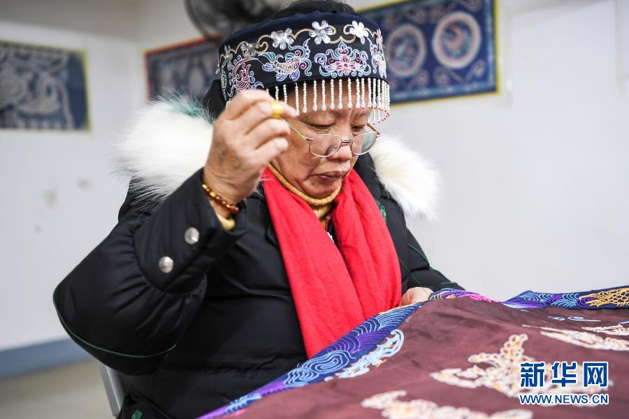 63歲的自治區(qū)級(jí)仫佬族刺繡代表性傳承人謝秀榮在工作室中創(chuàng)作(12月16日攝)。新華社記者 曹祎銘 攝