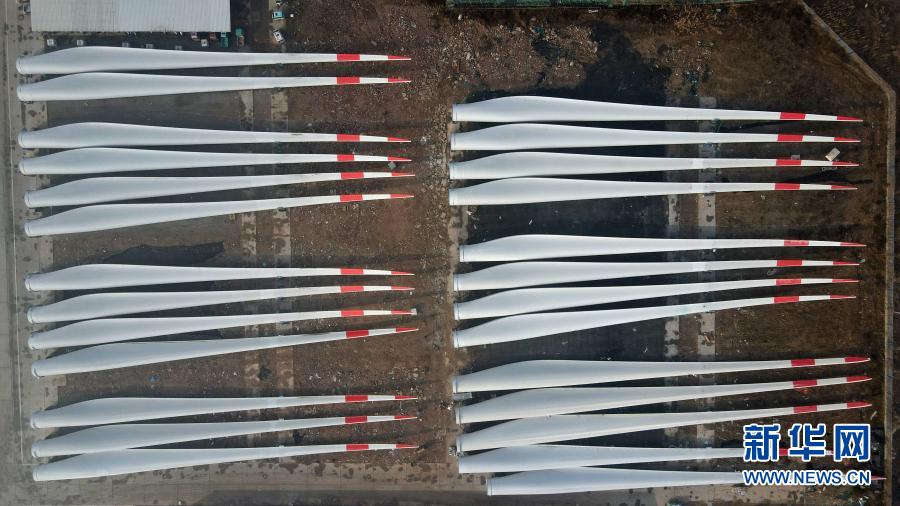 這是河北省威縣一家風電設(shè)施生產(chǎn)企業(yè)內(nèi)的大型風電機組葉片(12月8日攝,無人機照片)。新華社記者 牟宇 攝