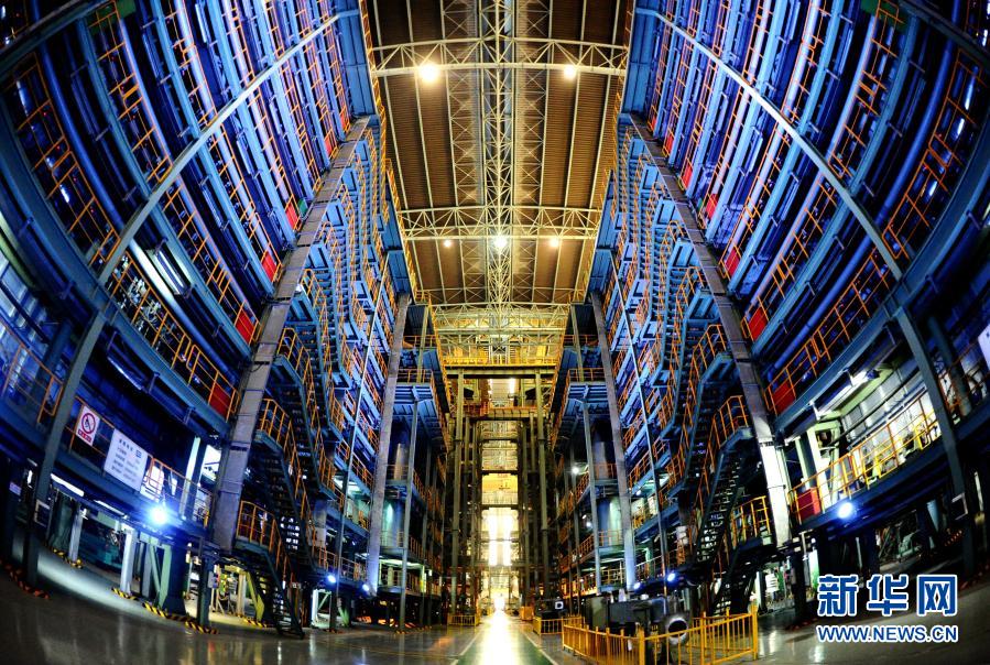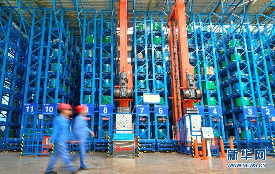 太鋼集團(tuán)員工走過(guò)超薄帶狀不銹鋼立體倉(cāng)庫(kù)(2019年5月24日攝)。新華社記者 曹陽(yáng) 攝