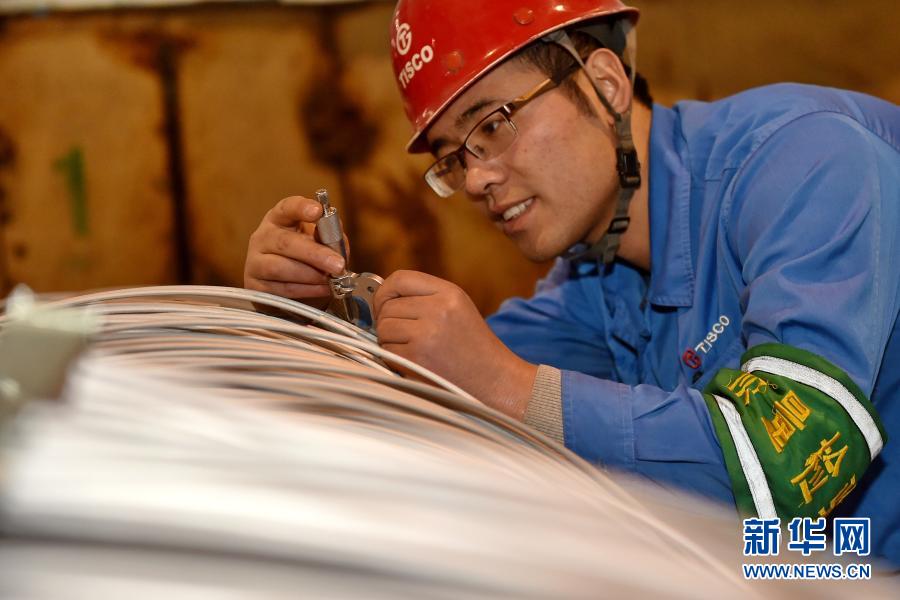 太鋼集團(tuán)的質(zhì)檢人員在檢驗(yàn)“筆尖鋼”鋼絲的質(zhì)量(2017年1月10日攝)。新華社記者 曹陽(yáng) 攝