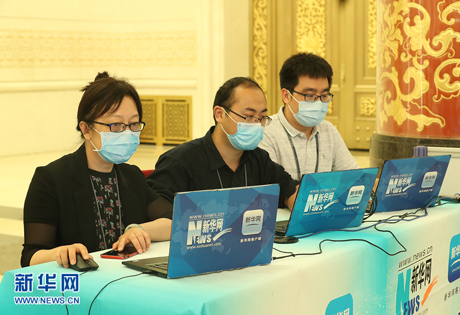 2020年5月28日下午十三屆全國人大三次會議閉幕后,國務院總理李克強在人民大會堂三樓金色大廳出席記者會并回答中外記者提問。為有效防控疫情,共同維護公共衛(wèi)生與健康,記者會采用網(wǎng)絡視頻形式進行。圖為新華網(wǎng)現(xiàn)場直播團隊。 新華網(wǎng) 王翰林 攝