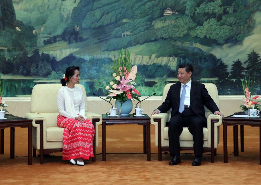 2015年6月11日,習(xí)近平以中共中央總書(shū)記、國(guó)家主席的身份,在北京會(huì)見(jiàn)昂山素季率領(lǐng)的緬甸民盟代表團(tuán)。