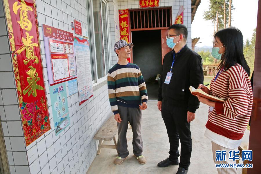 紀檢監(jiān)察干部向四川洪雅縣中山鎮(zhèn)鄒崗村建檔立卡貧困戶楊德彬(左一)核實產業(yè)扶貧資金落實情況(2020年3月18日攝)。新華社記者 江宏景 攝