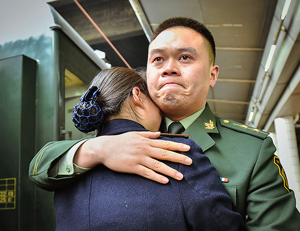 2016年2月3日下午,樊鼎來不及換下軍裝,就從他執(zhí)勤的廣州南站調(diào)班,趕到30公里外的廣州東站,雷云值乘的臨客列車將在這里靠站。