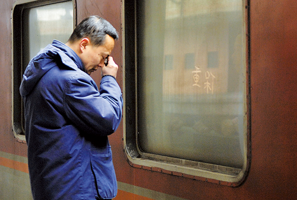 這時(shí)乘客們已經(jīng)基本都上車,站臺(tái)上留下不多的送站旅客。車窗里兩位老人,一位正在擦拭眼睛,另一位在小本子上寫字,再透過窗戶拿給車外的中年男子看。兩位老人揮手讓站臺(tái)上的男子先走,他卻一直站著,不斷低頭拭淚。小小的車窗成為臨別溝通的橋梁,玻璃上的“保重”則是他們對(duì)彼此最深情的叮囑。