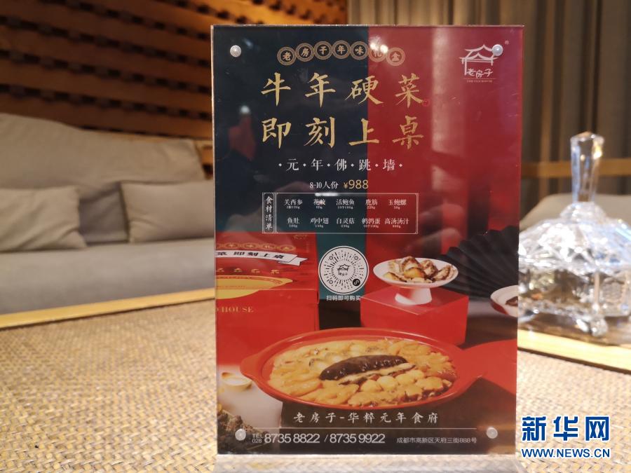 這是2月17日在成都一家中餐廳拍攝的春節(jié)期間推出的半成品“牛年硬菜”佛跳墻的廣告牌(手機照片)。新華社記者 胡旭 攝