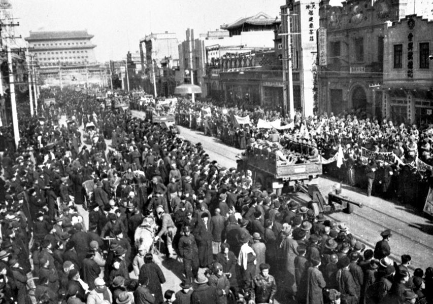 北平市民在正陽(yáng)門大街上夾道歡迎參加入城式的人民解放軍。 新華社圖片