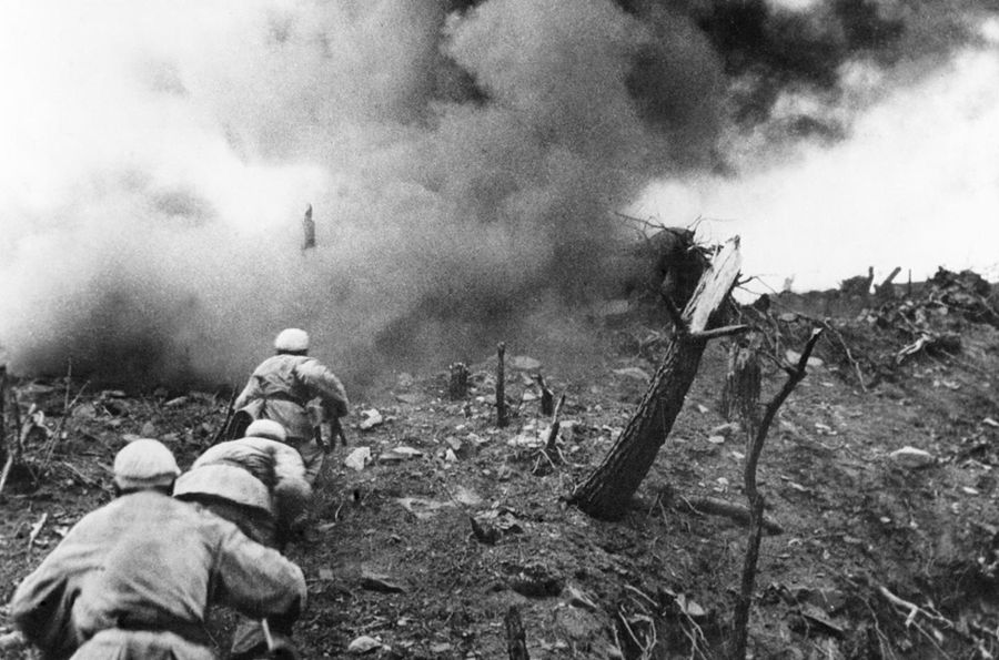 1952年,在上甘嶺戰(zhàn)役中,中國人民志愿軍指戰(zhàn)員在炮火支援下,攻上537.7高地北山。 新華社圖片
