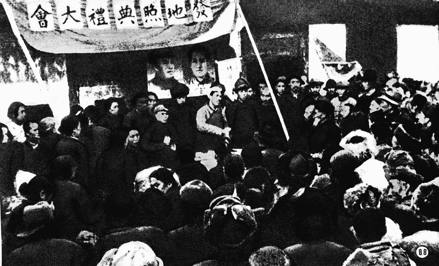 冀中農(nóng)民舉行擁護(hù)土地改革運(yùn)動(dòng)大會(huì)。 新華社圖片