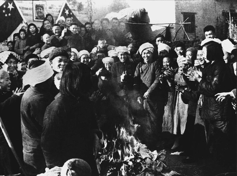 土地改革中湖南岳陽(yáng)縣策口鄉(xiāng)農(nóng)民燒毀舊地契。 新華社圖片