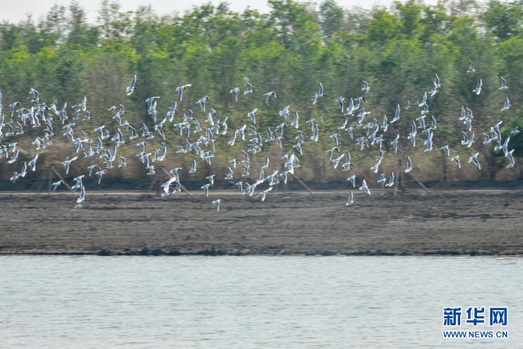 水鳥(niǎo)在天津市西青區(qū)西西海生態(tài)濕地上空飛翔(4月27日攝)。新華社發(fā)(孫凡越 攝)