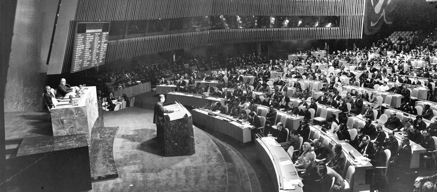 1971年9月,第二十六屆聯(lián)合國大會召開。從10月18日開始,聯(lián)合國大會就恢復(fù)中華人民共和國在聯(lián)合國的代表權(quán)問題進(jìn)行了一周的激烈辯論。10月25日,第二十六屆聯(lián)合國大會表決剛一結(jié)束,紐約聯(lián)合國會議大廳里立刻一片沸騰,雷鳴般的掌聲和歡呼聲一浪高過一浪,此起彼伏,經(jīng)久不息。新聞媒介評論道:“中國是在自己不在場的情況下,受到聯(lián)大三分之二以上國家的祝福,使聯(lián)合國發(fā)生根本變化?!?/p>