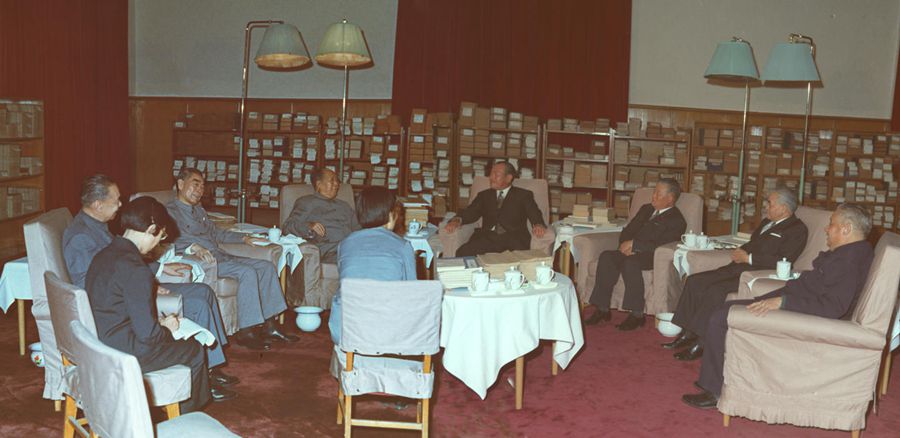 毛澤東主席會見日本國內(nèi)閣總理大臣田中角榮。新華社圖片