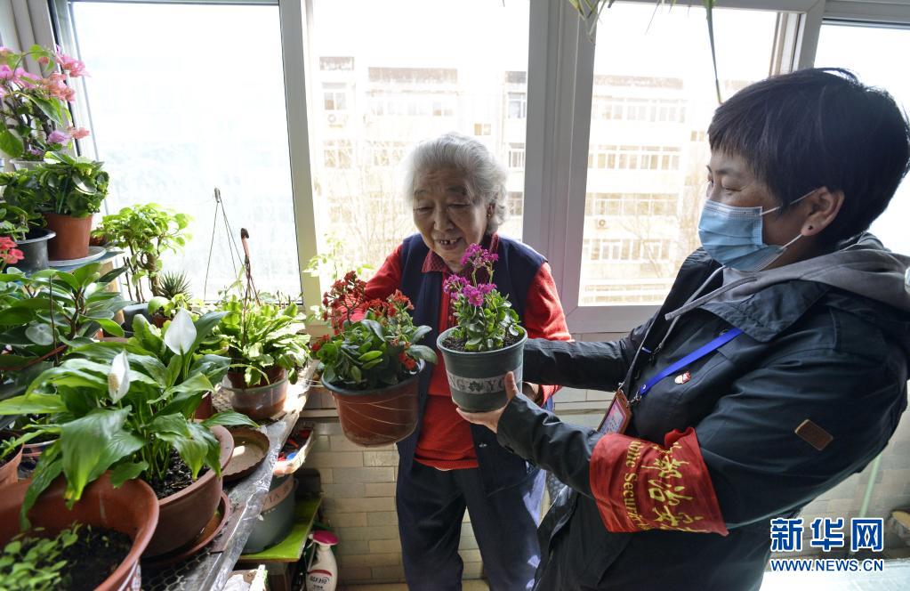 北京市豐臺區(qū)東高地街道黨員志愿者馮春紅(右)上門看望社區(qū)內(nèi)高齡老人王康鳳,了解老人居家生活情況(2020年4月1日攝)。新華社記者 李欣 攝