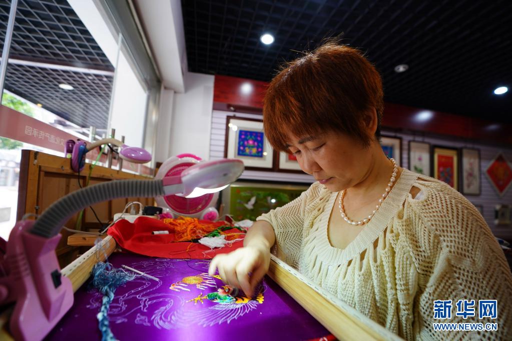 武漢市漢陽區(qū)江欣苑社區(qū)居民在進(jìn)行非遺刺繡創(chuàng)作(7月18日攝)。新華社記者 邢廣利 攝