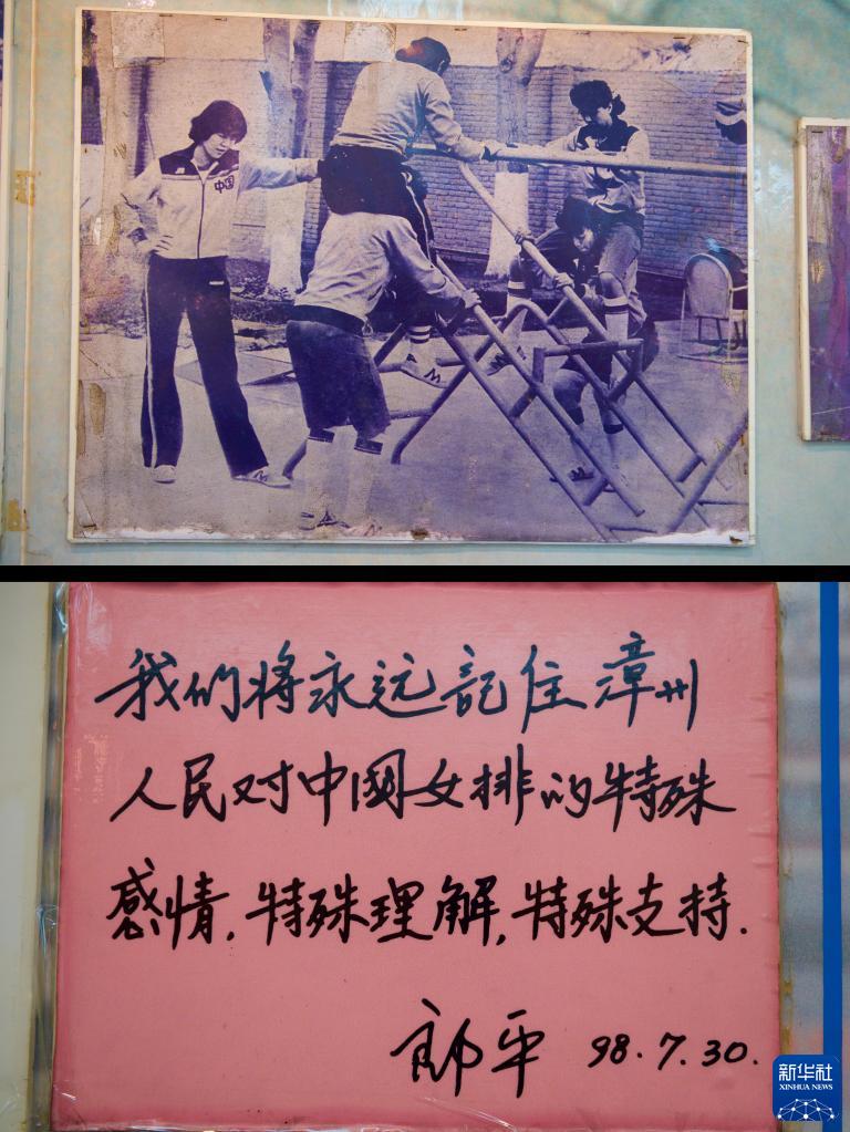 這是福建漳州體育訓(xùn)練基地中國女排騰飛館內(nèi)展出的郎平等老女排隊(duì)員當(dāng)年訓(xùn)練的照片(上),以及郎平于1998年寫給漳州人民的寄語(2016年8月31日翻拍)。新華社記者姜克紅攝