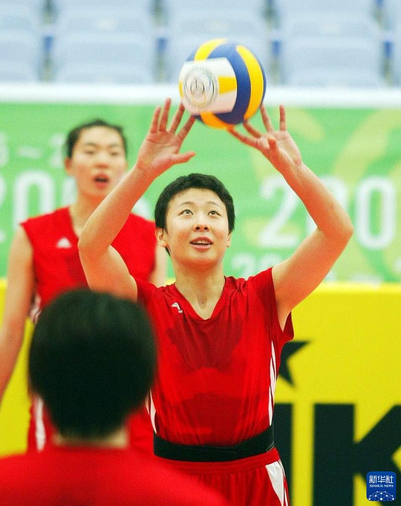 2005年6月23日,中國女排隊(duì)員馮坤(右)、張萍(后)在進(jìn)行戰(zhàn)術(shù)訓(xùn)練。新華社記者畢明明攝