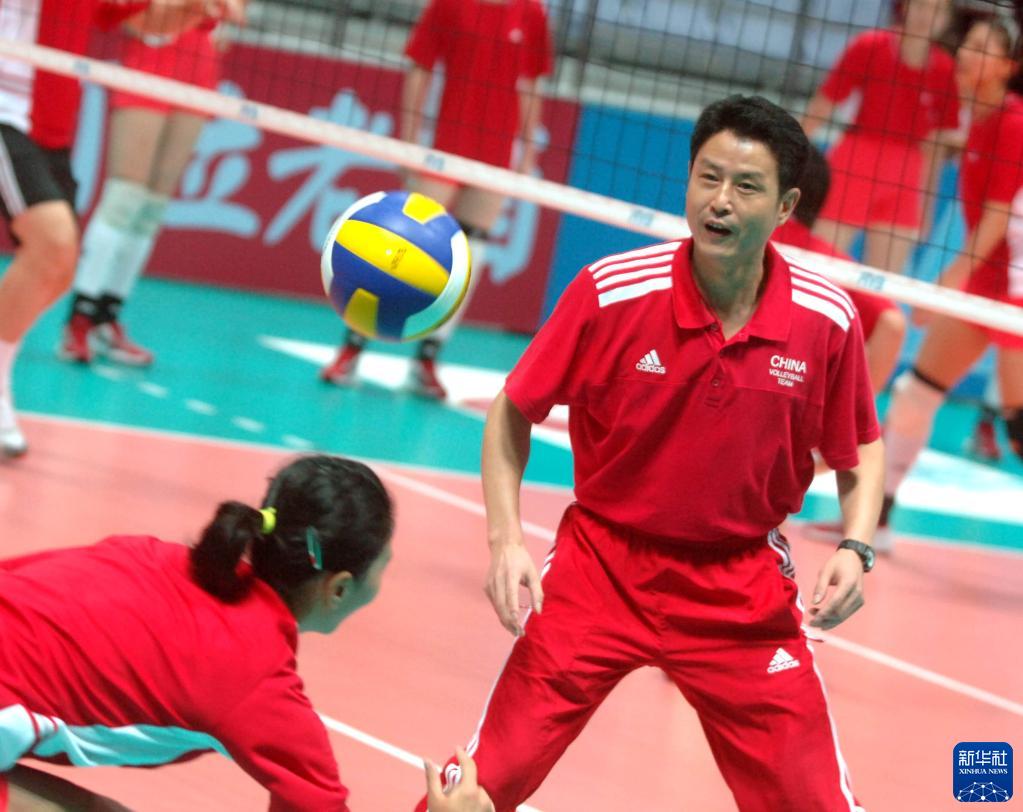 2006年8月30日,中國女排主教練陳忠和(右)在寧波北侖訓(xùn)練基地指導(dǎo)隊(duì)員進(jìn)行賽前訓(xùn)練。新華社記者徐昱攝