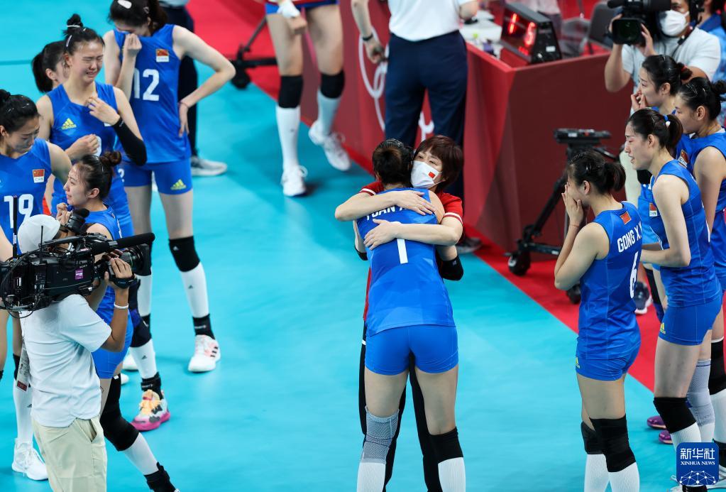 2021年8月2日,中國隊(duì)主教練郎平在比賽后與隊(duì)員一一擁抱。當(dāng)日,在東京奧運(yùn)會排球項(xiàng)目女排小組賽中,中國隊(duì)以3比0戰(zhàn)勝阿根廷隊(duì)。新華社記者 丁汀 攝