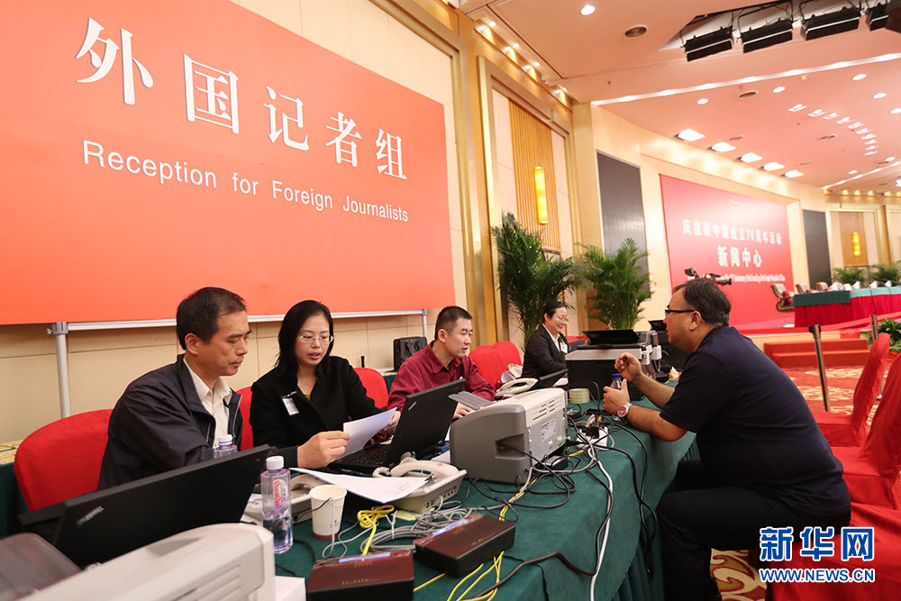 9月24日,慶祝中華人民共和國成立70周年活動(dòng)新聞中心在北京梅地亞中心二層新聞發(fā)布廳舉辦第一場新聞發(fā)布會(huì)。圖為新聞中心現(xiàn)場。新華網(wǎng) 雷東瑞 攝