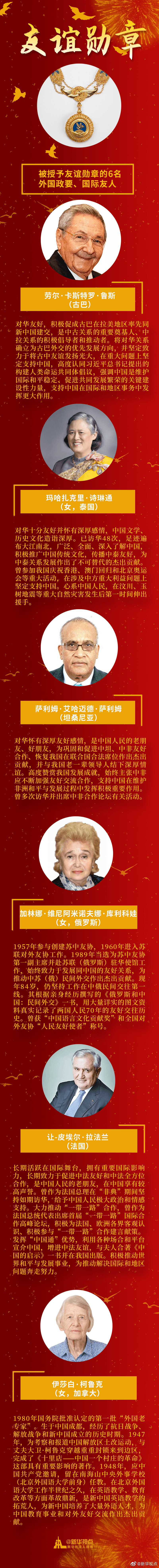 勞爾·卡斯特羅·魯斯、瑪哈扎克里·詩(shī)琳通等6人被授予“友誼勛章”。他們與中國(guó)結(jié)下不解情緣,留下一段段佳話(huà)。為他們點(diǎn)贊? ????