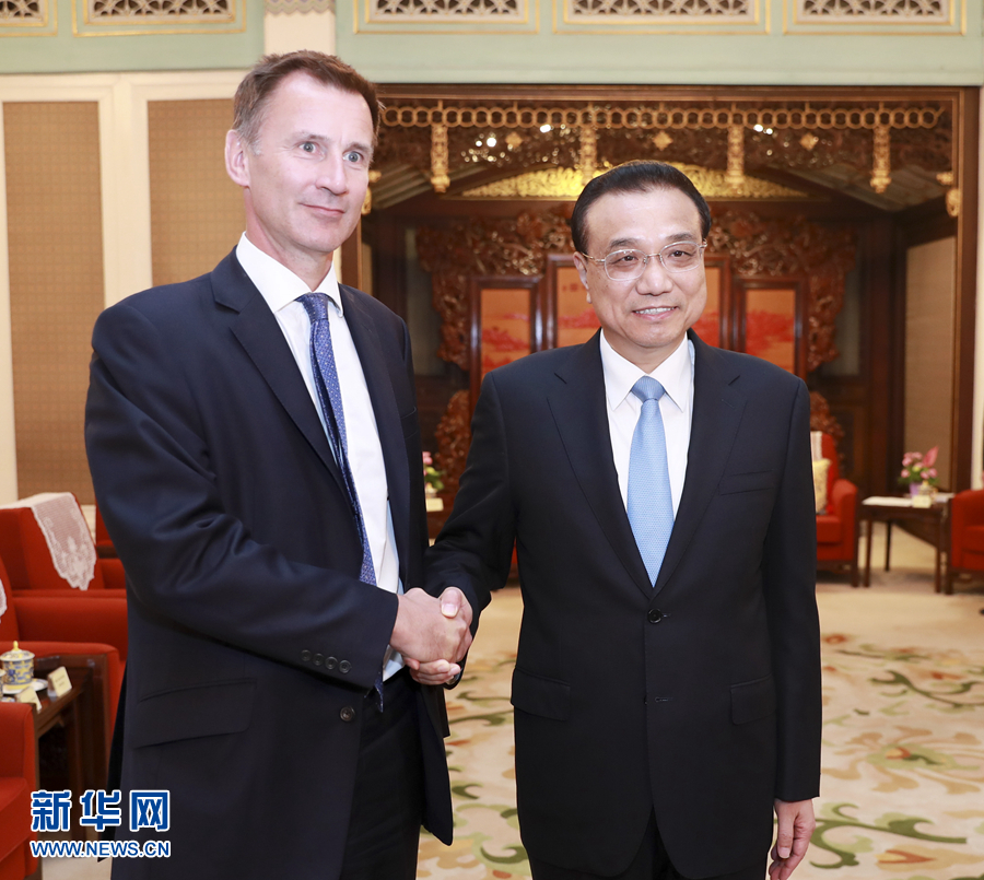 7月30日,國務(wù)院總理李克強(qiáng)在北京中南海紫光閣會見來華出席第九次中英戰(zhàn)略對話的英國外交大臣亨特。 新華社記者丁海濤攝