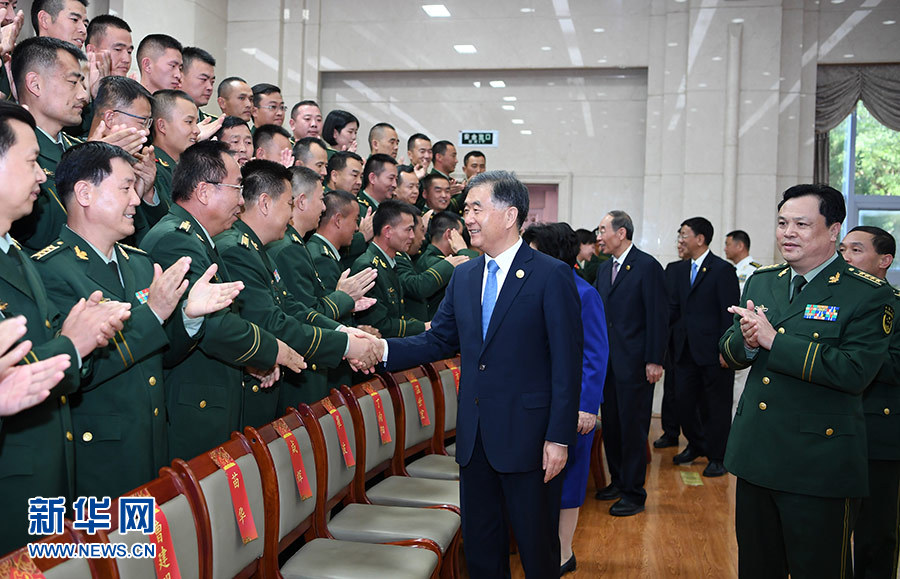 9月19日,中共中央政治局常委、全國政協(xié)主席、中央代表團(tuán)團(tuán)長汪洋率代表團(tuán)部分成員分別赴寧夏軍區(qū)、武警寧夏總隊(duì)慰問,并會(huì)見自治區(qū)政法系統(tǒng)代表。這是汪洋慰問武警寧夏總隊(duì)官兵代表。 新華社記者 張領(lǐng) 攝