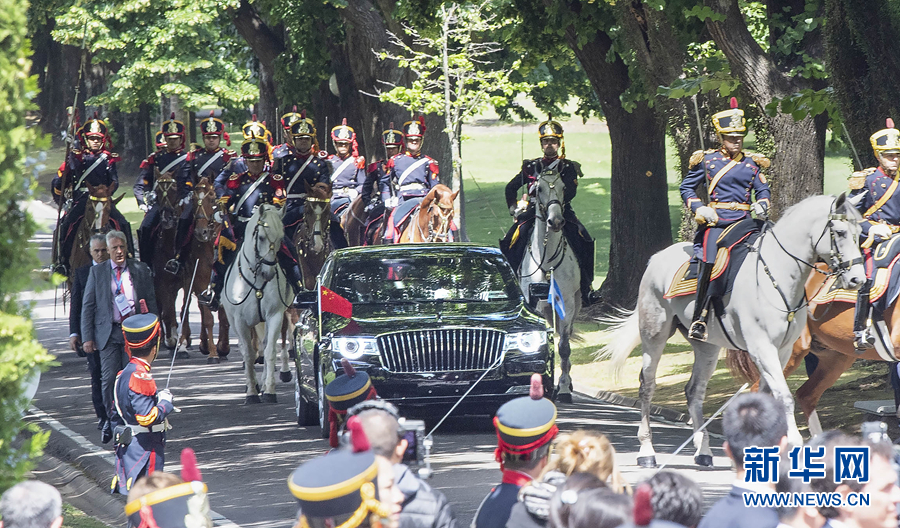 習(xí)近平和夫人彭麗媛在馬隊(duì)護(hù)衛(wèi)下前往總統(tǒng)官邸,禮兵在林蔭大道兩側(cè)列隊(duì)接受檢閱。抵達(dá)榮譽(yù)廣場(chǎng)時(shí),軍樂團(tuán)奏響歡快的進(jìn)行曲。馬克里和夫人阿瓦達(dá)上前熱情迎接。兩國(guó)元首夫婦登上檢閱臺(tái)。軍樂團(tuán)奏中國(guó)、阿根廷兩國(guó)國(guó)歌。