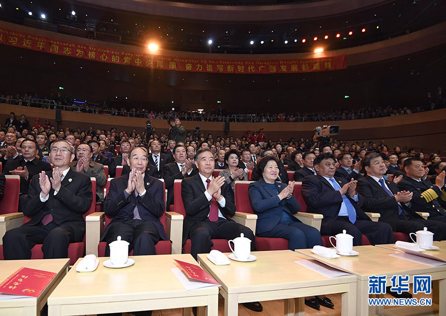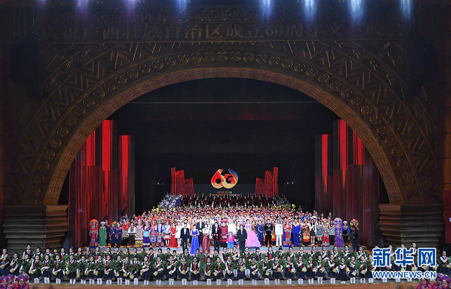 12月9日,慶祝廣西壯族自治區(qū)成立60周年文藝晚會《壯志飛揚》在廣西文化藝術(shù)中心精彩上演。中共中央政治局常委、全國政協(xié)主席、中央代表團團長汪洋和各族各界干部群眾等近900人觀看演出。 新華社記者 申宏 攝