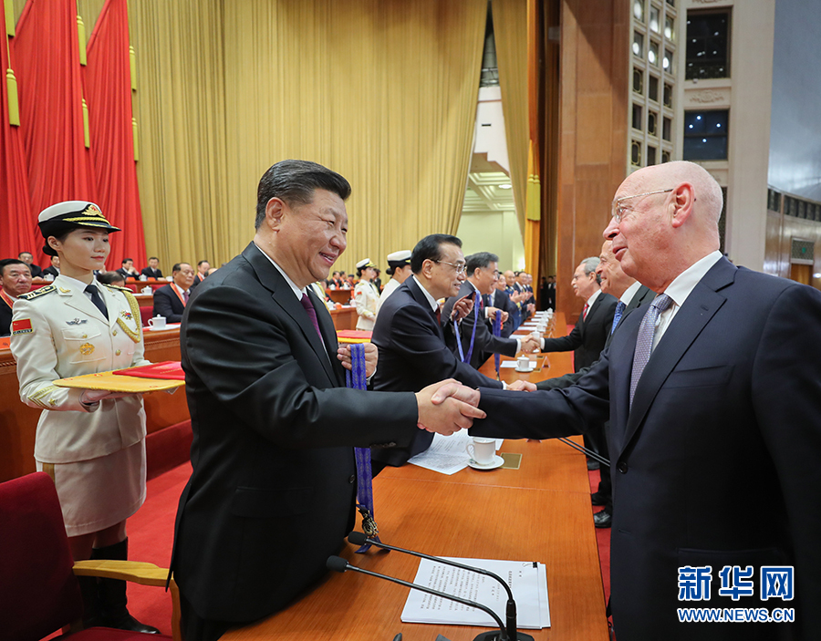 12月18日,慶祝改革開放40周年大會在北京人民大會堂隆重舉行。中共中央總書記、國家主席、中央軍委主席習(xí)近平在大會上發(fā)表重要講話。這是習(xí)近平等為獲得中國改革友誼獎(jiǎng)?wù)氯藛T代表頒獎(jiǎng)。 新華社記者 鞠鵬 攝