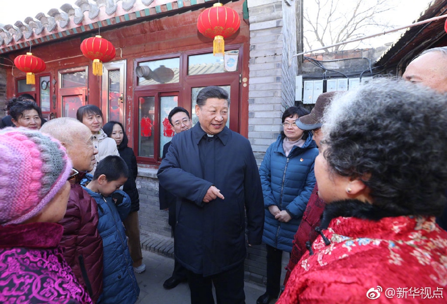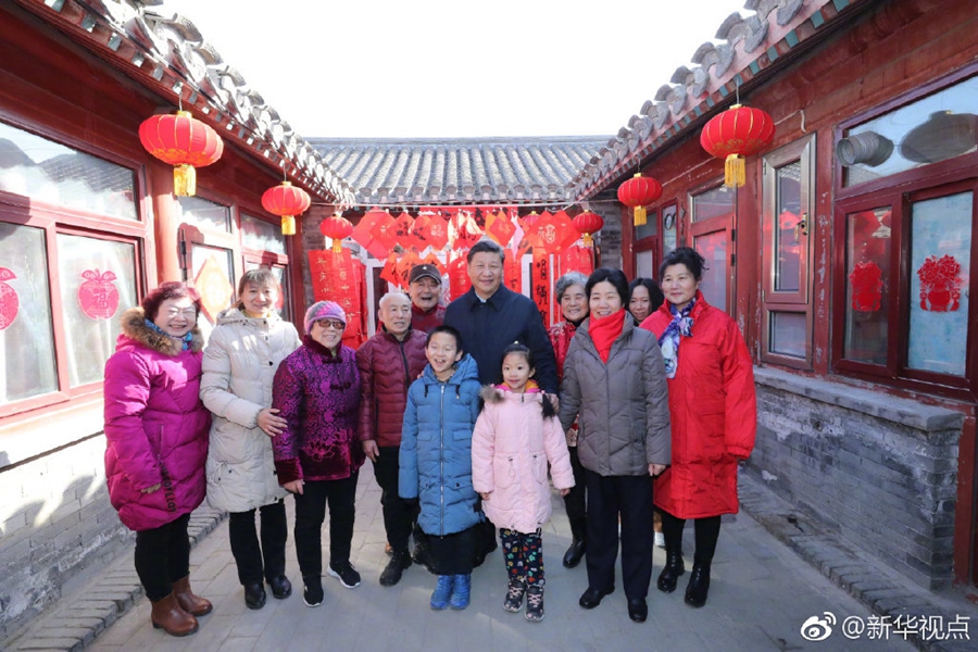2月1日上午,習(xí)近平來到前門東區(qū),沿草廠四條胡同步行察看街巷風(fēng)貌,聽取區(qū)域規(guī)劃建設(shè)、舊城保護(hù)整治、人居環(huán)境改善等情況介紹,先后走進(jìn)兩個四合院看望,同這里的居民一起包餃子、炸饹馇、貼“?!弊?、聊家常,仔細(xì)詢問住房環(huán)境有沒有改善、年貨備齊沒有、生活還有什么困難,祝他們生活幸福、新春快樂。四合院里笑語歡聲,習(xí)近平對他們說,中國共產(chǎn)黨的追求就是讓老百姓生活越來越好。(記者張曉松、鞠鵬)
