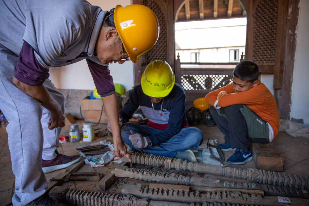 2019年10月10日,在尼泊爾加德滿都杜巴廣場,中國文物修復(fù)師周建國(左)在九層神廟修復(fù)現(xiàn)場指導(dǎo)尼泊爾工人。新華社記者張可任攝
