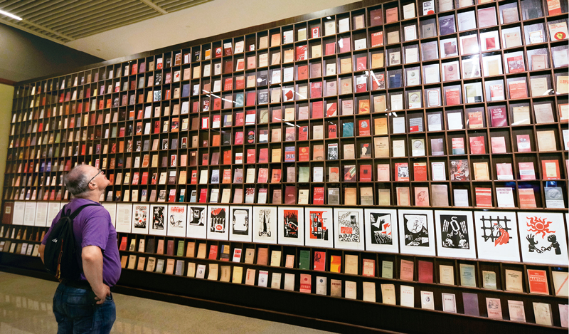 2018年5月9日,一位外國觀眾被北京“真理的力量——紀(jì)念馬克思誕辰200周年主題展覽”中一面展示不同國家出版的500多種《共產(chǎn)黨宣言》的書墻所吸引。 中新社記者 賈天勇/攝