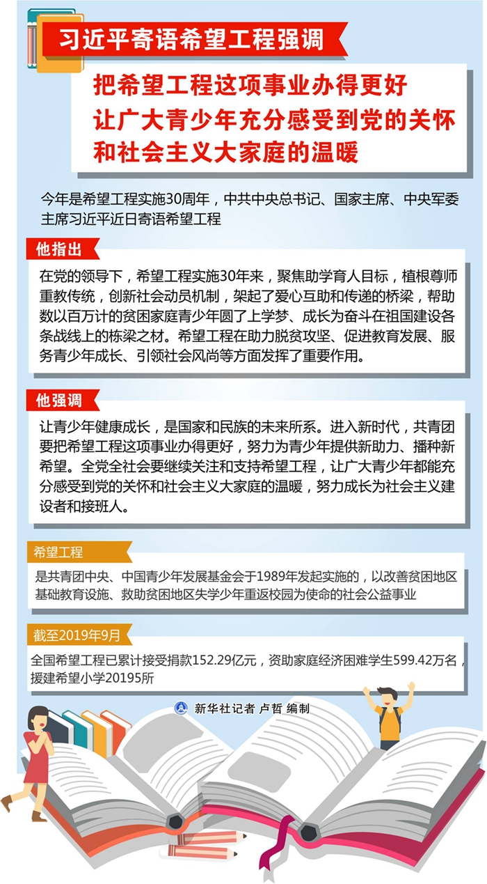 習(xí)近平強(qiáng)調(diào),讓青少年健康成長,是國家和民族的未來所系。進(jìn)入新時代,共青團(tuán)要把希望工程這項事業(yè)辦得更好,努力為青少年提供新助力、播種新希望。全黨全社會要繼續(xù)關(guān)注和支持希望工程,讓廣大青少年都能充分感受到黨的關(guān)懷和社會主義大家庭的溫暖,努力成長為社會主義建設(shè)者和接班人。