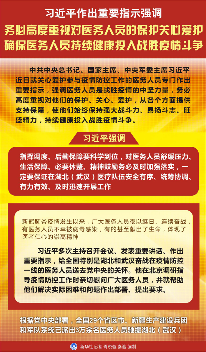 習(xí)近平強(qiáng)調(diào),指揮調(diào)度、后勤保障要科學(xué)到位,對醫(yī)務(wù)人員舒緩壓力、生活保障、必要休整、精神鼓勵務(wù)必及時加強(qiáng)落實,一定要保證在湖北(武漢)醫(yī)療隊伍安全有序、統(tǒng)籌協(xié)調(diào)、有力有效、及時迅速開展工作。