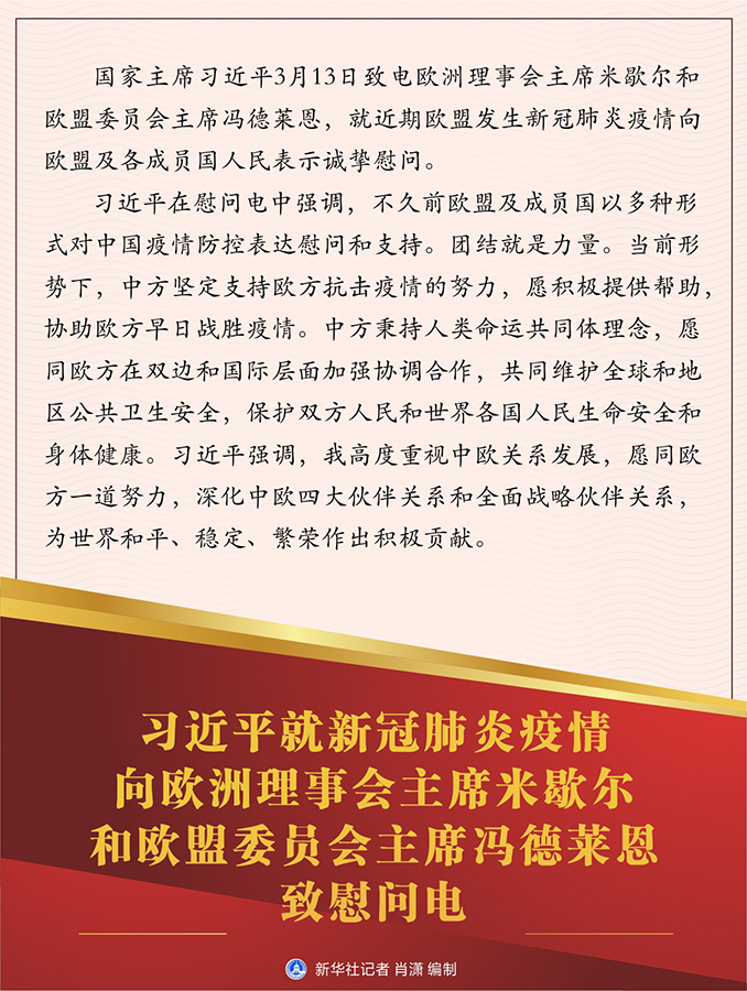 新華社北京3月14日電? 國家主席習(xí)近平3月13日致電歐洲理事會主席米歇爾和歐盟委員會主席馮德萊恩,就近期歐盟發(fā)生新冠肺炎疫情向歐盟及各成員國人民表示誠摯慰問。