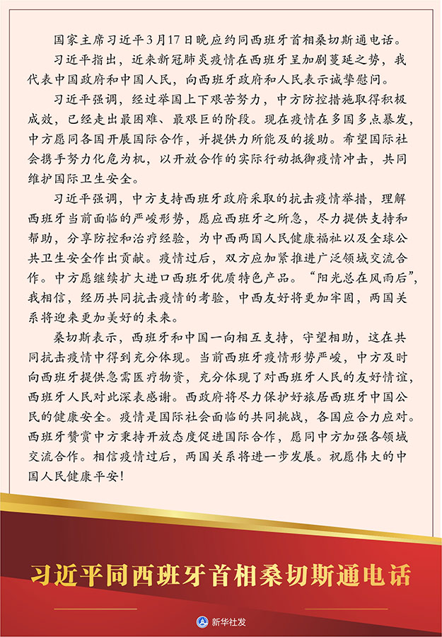 新華社北京3月17日電 國家主席習(xí)近平17日晚應(yīng)約同西班牙首相桑切斯通電話。
