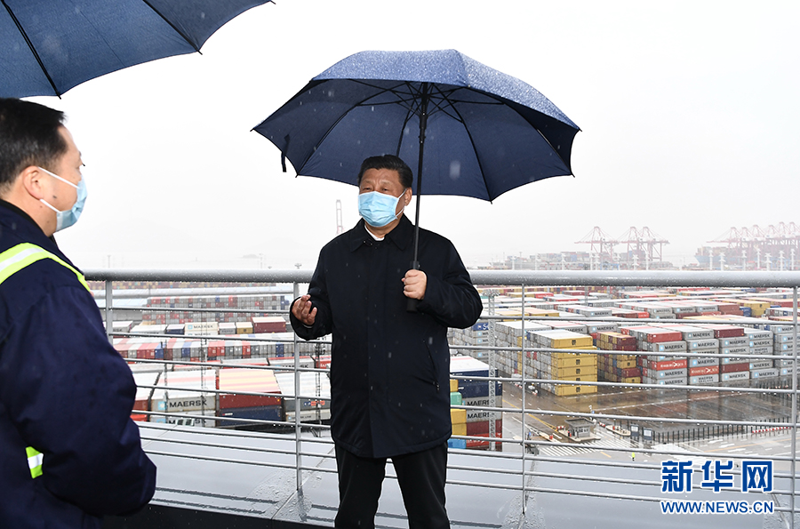 3月29日,中共中央總書記、國家主席、中央軍委主席習近平在浙江考察調(diào)研。這是習近平在寧波舟山港穿山港區(qū)碼頭了解港口復工復產(chǎn)情況。 新華社記者 燕雁 攝