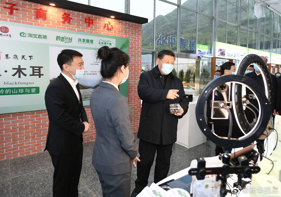 正在陜西考察的習(xí)近平總書(shū)記20日下午來(lái)到柞水縣小嶺鎮(zhèn)金米村。金米村地處秦嶺深處,近年來(lái)依靠發(fā)展木耳等產(chǎn)業(yè)擺脫了貧困。村培訓(xùn)中心,幾位村民正在做網(wǎng)上直播賣(mài)貨的準(zhǔn)備工作,總書(shū)記走到直播平臺(tái)前,同他們親切交談起來(lái)。他表示,電商作為新興業(yè)態(tài),既可以推銷(xiāo)農(nóng)副產(chǎn)品、幫助群眾脫貧致富,又可以推動(dòng)鄉(xiāng)村振興,是大有可為的。(文字記者:張曉松 攝影記者:鞠鵬、謝環(huán)馳、燕雁、翟健嵐)