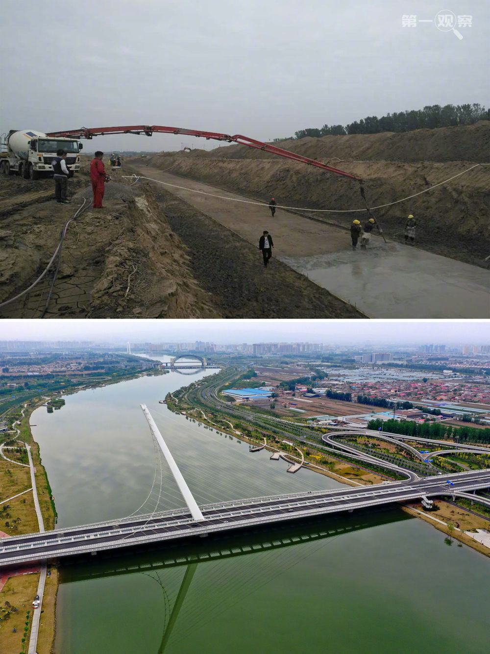 ?↑拼版照片:上圖為2017年10月5日拍攝的太原市汾河城區(qū)段治理美化三期工程施工場景(資料照片);下圖為2020年4月29日無人機拍攝的太原市汾河兩岸景色(新華社記者 曹陽 攝)。