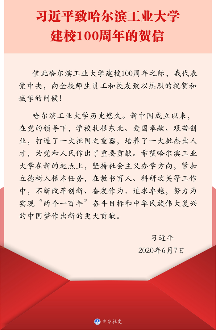 新華社北京6月7日電 中共中央總書記、國家主席、中央軍委主席習近平7日致信祝賀哈爾濱工業(yè)大學建校100周年,向全校師生員工和校友致以熱烈的祝賀和誠摯的問候。